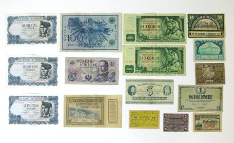 Samling bestående af Danmark, 1 Kr 1921 W, 5 kr 1955 B1, nødpengeseddel 50 Pfenning Rødding 1920, 50 Schilling 1962, 100 Mark 1908 pæn, 3 stk. 500 Pesetas 1971 i nr. rækkefølge (pæne), 6 stk. diverse Kassenscheine Hinterbühl Østrig samt 2 stk. 100 Cezko Korun 1961.