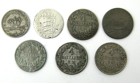 Lot bestående af Fredrik IV Glückstadt, 2 Skilling 1716, Christian VIII, 4 R.B.S 1842 og 3 R.B.S 1842 samt Frederik VII, 4 Skilling Rigsmønt 3x 1854 og 1x 1856.
