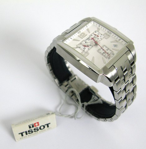 Tissot 1882 herrearmbåndsur i rektangulær urkasse og med lænke af stål. Hvis skive med arabertal og stregindikation, central sekundviser, datovisning i #4½ position samt chronographfunktioner. Quartzværk, Urkasse 40 x 40 mm.