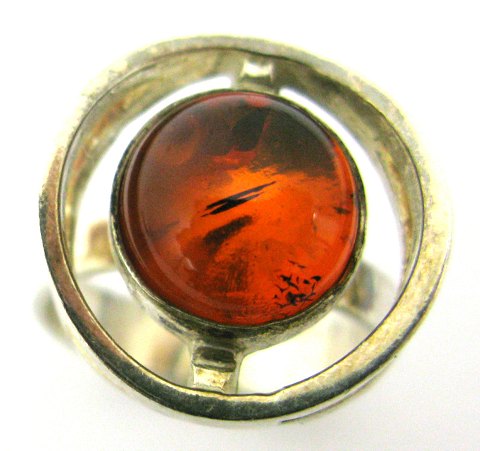 Ring af sterling sølv med forhøjet front, prydet med poleret, mabeformet ravstykke. Ring Str. 58½