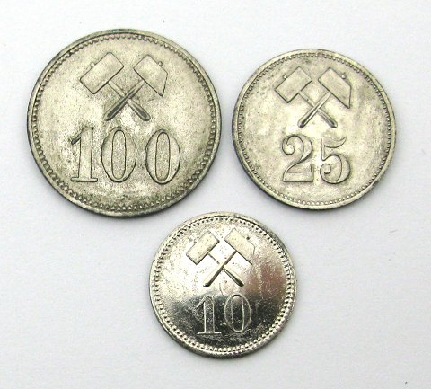 Aktieselskabet Grønlandsk Minedrift udvandt blandt andet kobber i Julianehåb området. Firmaet fik fremstillet disse private betalingstegn hos L. Chr. Lauer i Nürnberg.