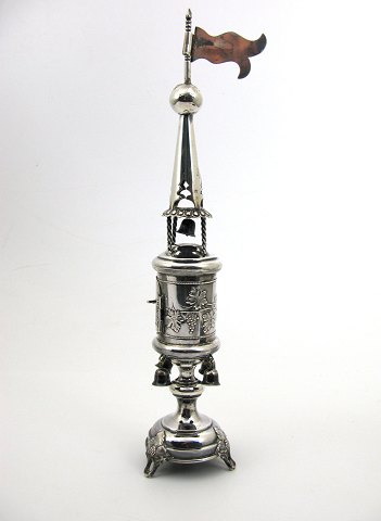 The cylindrical spice compartment as well as the tower is with five dangeling bells. The spice compartment is delicately driven with grape and wineleaf ornaments and made with a hinged door to allow insertion of the spices. Knopped stem and turned base endings with foliate cast stem. The upper section is made in a conical shape ant topped with a large pennant. Top flag and stand marks for Izrael Szeikmann - Poland approx. 1880