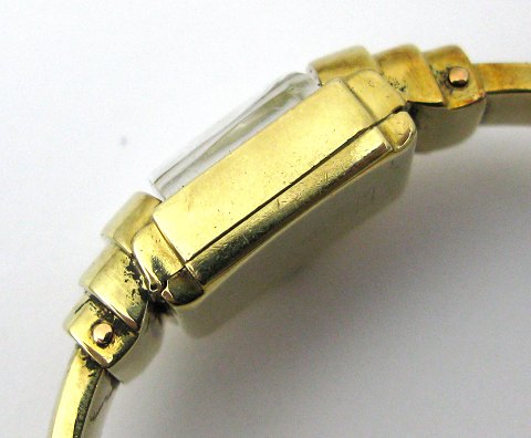 Damearmbåndsur, mærket *R* i urkasse og med lænke af 14 kt. guld. Ligesidet urkasse med metalgrå skive med stregindikation og arabertal. Manuel mekanisk optræksværk. Urkasse 14 x 14 mm., samlet vægt ca. 19 gr.