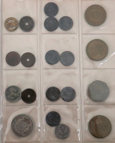 1 øre, 2 øre, 5 øre, 1 kr, 5 kr, 10 kr - heriblandt 2 kr sølv 1875, 5 kr sølv erindringsmønt 1964 samt England 5 og 50 new pence og one shilling 1948