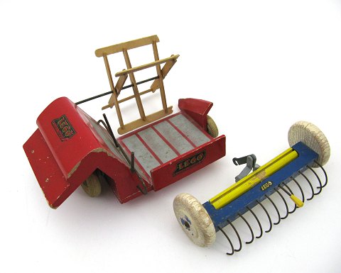 Lot bestående af Lego harve og halmbinder af træ med metaldele.