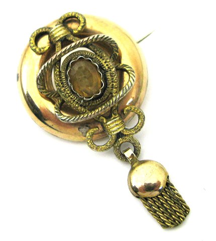 Antik broche af 14 kt. guld, prydet med facetsleben citrin 8 x 10 mm. Broche L. 53 mm. Tilskrevet Mester Boh Mathiesen (1850-1905), Højer. Omtalt som guldsmed og urmager.