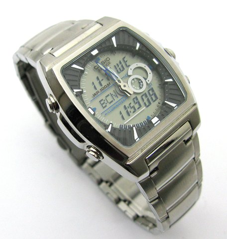 Casio Edifice Analog/digital herrearmbåndsur i urkasse og med lænke af stål. Rektangulær skive med analog og digital tidtagning, stregindikation, termometer, dual chrono timer, lab memory 50, verdensur og auto belysning. Quartsværk. Urkasse 36 x 36 mm.