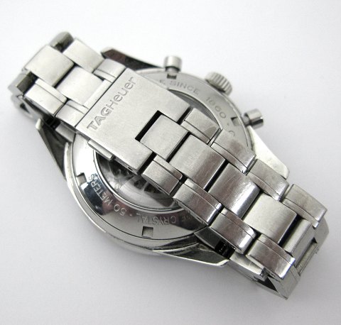 Tag Heuer Carrera Chronograph herrearmbåndsur, ref. nr. CV2014-1 i urkasse og med lænke af stål. Sort skive bag safirglas med tachymeter lynette, stregindikation, central- og separat sekundviser, chronograph funktioner og datovisning i #3 position. Quartzværk caliber 16. Urkasse diameter 42 mm.