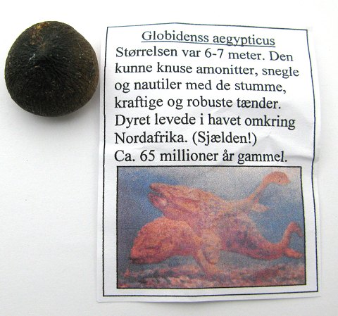 Fossil knusetand fra Globidanss Aegypticus hav dinosaur, 6 - 7 mtr. lang. Levede i den sene kridttid for ca. 65 mio. år siden. Et ualmindeligt fossil., diameter 3,5 cm.