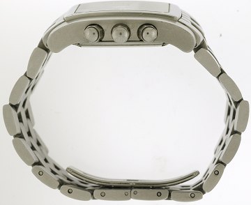 Longines herrearmbåndsur i rektangulær urkasse og med lænke af stål. Sort skive med romertal og stregindikation, central og separat sekundviser/ timer, datovisning i #4 position samt chronograph funktioner. Quartzværk. Urkasse diameter 28 x 41 mm.