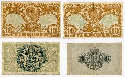 Danmark, 2x 10 kr 1941, 1943, 5 kr 1943 og 1 kr 1920 (4)