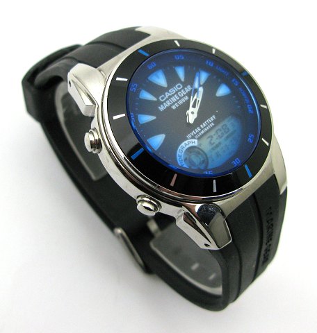 Casio Marine Gear Unisex armbåndsur i urkasse af stål. Analog skive med pileindikation. Digital timer, dato, sekunder og tidevand indikator m.v.