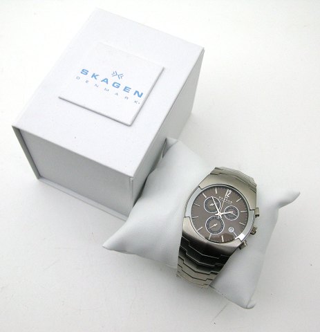 Skagen herrearmbåndsur i urkasse og med lænke af stål. Metallic tonet skive med stregindikation, central sekundviser samt separat dag, dato og chronograph funktion. Quartzværk. Urkasse diameter 39 mm.