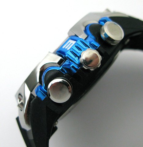 Calypso digital Chrono herrearmbåndsur i urkasse af metal/kunststof og lænke af sort gummi med metalspænde. Sort skive med blåtonede dele. Analog og digital tidstagning, datovisning og chronographfuktioner. Quartzværk. Urkasse diameter 50 mm. Et letvægts løbeur.