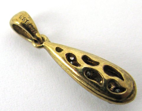 Vedhæng af 8 kt guld med facetslebne sten, L. 12 mm.