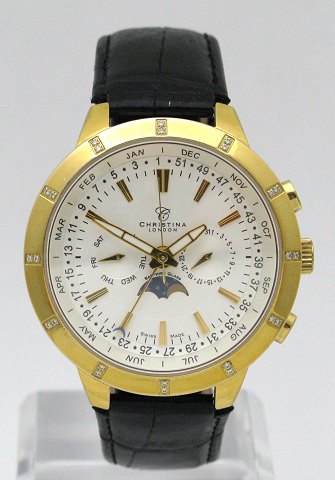 Christina of London herreur af stål forgyldt prydet med små brillanter og læderrem. Quartzværk - med kronograf, månefase og multikalender. Kassen er 42 mm diameter - prydet med 24 meget små brillander på i alt 0,12 ct Top Wesselton/VVS. Ny og ubrugt original sort læderrem.