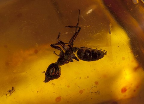 Poleret ravstykke med inklusion i form af edderkop og myg, ca. 25 x 20 mm.