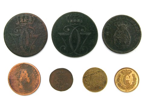 Lot bestående af Christian VII, 2x 1 Skilling 1771, Frederik VI, 1 Skilling 1812, 1 Rigsbankskilling 1813, 1 Rigsbankskilling 1818. Frederik VII, ½ Skilling 1857 og Christian IX, ½ Skilling 1868 - sidstnævnte er et nydeligt eksemplar.