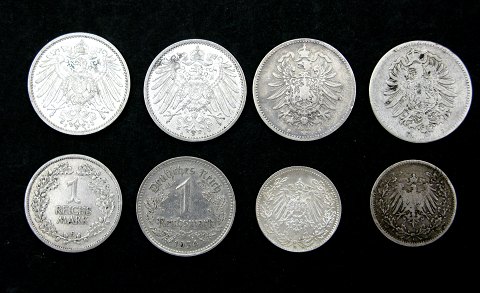 Lot bestående af 1 Mark sølv 1874, 1875, 1911A og 1914J, 1 Reischsmark 1925E og 1934A, samt ½ Mark sølv 1905 og 1915. 8 mønter i alt.