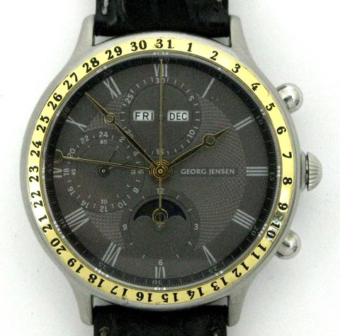 Georg Jensen Chronograph herrearmbåndsur i urkasse af stål med lynette af 18 kt. guld. Koksgrå skive med romertal, central og separat sekundviser, månefase, dag/dato visning i #12 position samt chronograph funktioner. automatisk Valjoux værk, urkasse diameter 42 mm. Croco læderem med original Georg Jensen metalspænde.