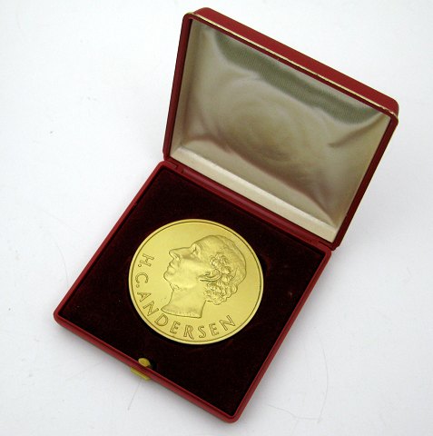 Limiteret H.C. Andersen medaille af forgyldt metal, præget i anledning af H.C. Andersens 100 års dag 1805-1875-1975, diameter 55 mm.