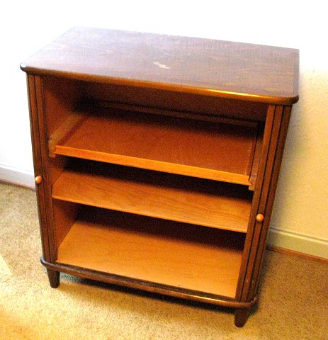 Lille jalousiskab med to skydelåge foran, indvendig udtræksbakke og enkelt hylde. 70 x 70 x 42 cm.