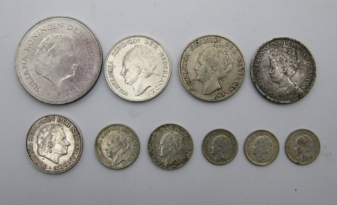 Lot bestående af 1 Gulden 1917, - 30, -39, -54. 25 Cents 2x 1941, 3x 10 Cents 1936, -38, -39, samt erindringsmønt 10 Gulden 1970. (10)