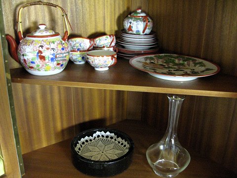 Hjørneskab af teak med indhold i form af ordinær japansk théstel,