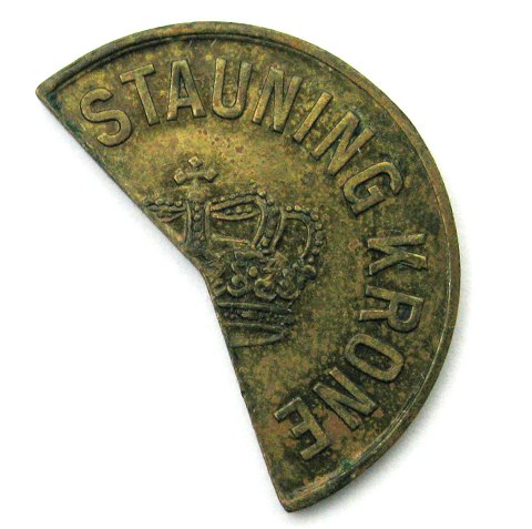 Stauning kronen har ligesom den rigtige, Christian X´s kronede monogram på forsiden og en krone på bagsiden, men bærer inskriptionen "Stauning krone" på begge sider. Ellers er kun små detailler anderledes, f.eks. er 19-tallet større. Den bortskårne del svarer til de 44%, hvormed kronen skulle være blevet forringet efter devalueringen i forbindelse med Kanslergadeforliget. Konservative var ikke med til forliget og Konservativ Ungdom lod mønten fremstille i 50.000 eksemplarer hos Rich. Müller i København og solgte derefter mønten for 56 øre i hele landet - overskuddet gik i partikassen.