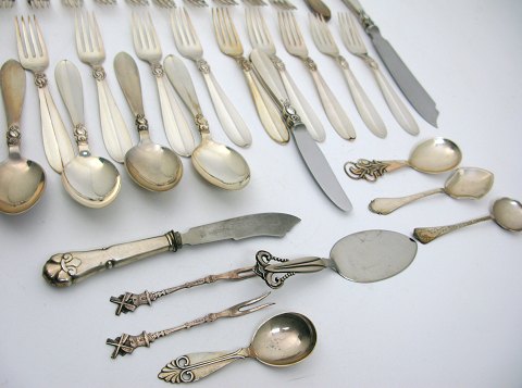 Lot bestående af 12 frokostgafler, 10 frokostskeer, 5 middagsskeer, 9 middagsgafler, 1 middagsske, 13 théskeer, 1 moccaske, 1 kagegaffel, 1 pålægsgaffel, 1 marmeladeske, 1 kagkniv, 1 kagespade.
