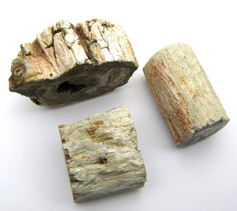 3 stk. opskårne og dobbeltsidig slebne segmenter af ca. 180 millioner gammelt forstenet træ. Diameter ca. 20 - 40 mm.