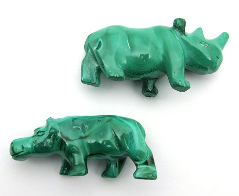 Malakit, to håndskårne dyr fra Kenya *Flodhest og Næsehorn*