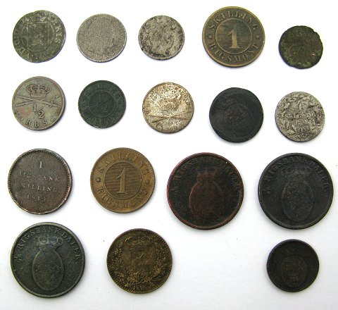 Lot bestående af 1 Skilling 1812 og 3x 1 Skilling 1818, 3x 1 Skilling 1856, 2 Skilling 1677 og 2x 1815, ½ Skilling 1842 og 1857, 3 Skilling 1842 og 4 Skilling 1842, -54 og 1856