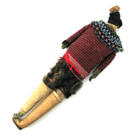 Antik Grønlænderdukke fra ca. 1870 af sælskind og overtøj af ternet stof med perlebroderi. Hoved ligeledes af sælskind med påmalet ansigt. H. 32 cm.