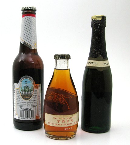 Lot bestående af Tysk sekt *Die kleine Komödie*, *Berliner Kindl Jubilæumspilsner* samt lille flaske Sake, fremstillet for Nanking restaurant i Hamburg.