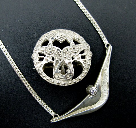 Halssmykke med vedhængsegment, prydet med sten, L. 40 cm. Broche diameter 27 mm. Samlet vægt ca. 15 gr.