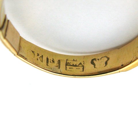 Guldsmedestempler i skinnen har vi p.t. ikke kunne identificere, men arbejder på sagen. Ringstr. 63, vægt ca. 3,5 gr.