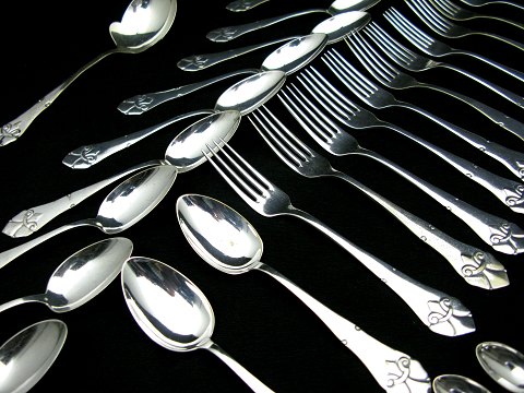 Lilje bestikservice af forsølvet metal, bestående af 12 middagsgafler, 12 midagsskeer, 12 frokostskeer, 12 théskeer, 2 pålægsgafler og 1 kartoffelske.