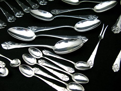 Lilje bestikservice af forsølvet metal, bestående af 12 middagsgafler, 12 midagsskeer, 12 frokostskeer, 12 théskeer, 2 pålægsgafler og 1 kartoffelske.
