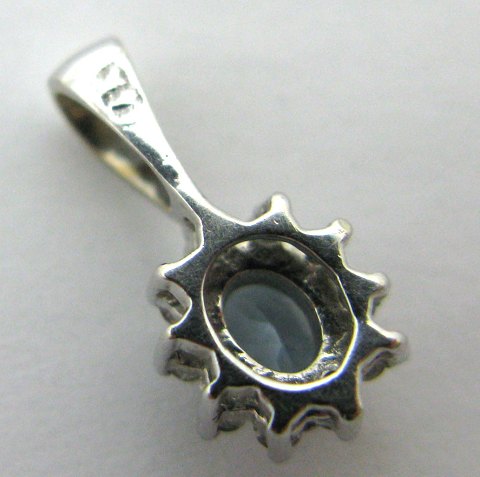 Vedhæng af 14 kt. hvidguld med oval rosettefront, prydet med 10 brillantslebne diamanter, tilsammen 0,11 ct. samt oval, facetsleben aquamarin på 0,16 ct., vægt ca. 1 gr., L. 13 mm. Certifikat medfølger.