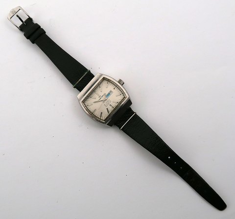 TD - Tenor-Dorly damearmbåndsur i rektangulær urkasse af stål. Metallic grå skive med stregindikation, central sekundviser og dag/dato visning i #3 position. Automatisk urværk. Urkasse 32 x 32 mm. Læderrem med metalspænde.