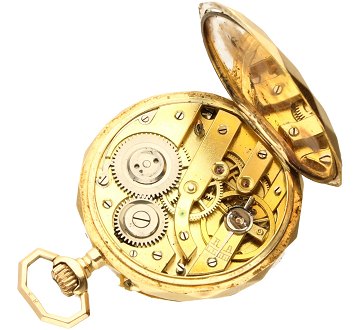 Hvidemaljeret skive med arabertal og forgyldte visere.