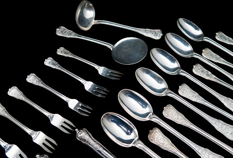 A. Michelsen *Rosenborg* bestik af sølv bestående af 6 frokostskeer, 6 frokostgafler, 6 frokostknive, 6 kagegafler, 4 théskeer samt sauceske og kagespade. Samlet vægt ca. 1160 gr. uden knive.