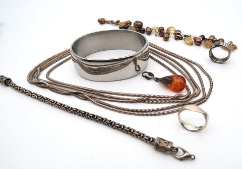 Lot bestående af 2 ringe af sterling sølv, Str. 55 og 53, armlænke af sterling sølv, prydet med charms af sten, L- 18 cm., orientalsk armlænke af sølv, L. 20 cm., forsølvet, 5 radet collier, L. 40 cm. samt jugendstil vedhæng af sølv med ravdråbe, L. 45 mm., samt Dyrberg/Kern armring af metal.