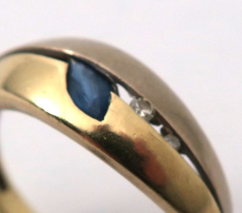 Ring af guld 14 kt prydet med 2 små diamanter samt safir