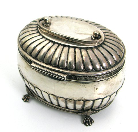 Svensk bonbonniere af sølv på fire løvefødder med ovalt korpus, drevet med bukler. foroven bøjlehank. Ydermere rundtom med kantdekorationer. Ca. 13 x 10 x 11 cm., vægt ca. 367 gr.