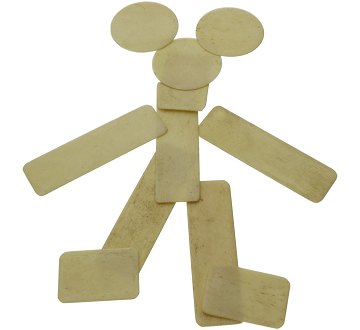 Tre slags brikker: 40 lange (ca. 2,5 gram stykket), 40 runde (ca. 1,5 gram stykket) og 20 rektangulære (ca. 1,25 gram stykket).