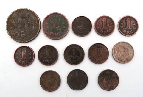 Bestående af 1 øre 1891,1904,07,09,12,13,19B,21,22,23 2øre 1916, 5 øre 1918J, 25 øre 1921