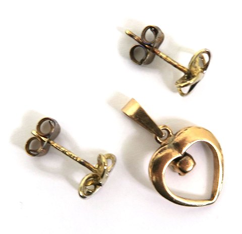 Par ørestikker af 8 kt guld, vægt ca. 1 gr. samt hjerteformet vedhæng af guld doublé med sten. L. 20 mm.