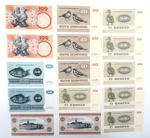 Samling danske sedler bestående af 3 x 10 kr *Portræt og landskab* 1972 C0 i nummer rækkefølge, 3 x 10 kr *Maleri og dyr* 1977 B6 i nummer rækkefølge, 3 x 10 kr *Maleri og dyr* 1978 B8 i nummer rækkefølge, 3 x 20 kr maleri og dyreudgaven 1979 A0 i nr.-rækkefølge, 2 x 50 kr *Maleri og dyr* 1982 C0 og 1984 C3. 2 x 100 kr *Berømte mænd og kvinder* 2005 C2 og 2008 D2.
